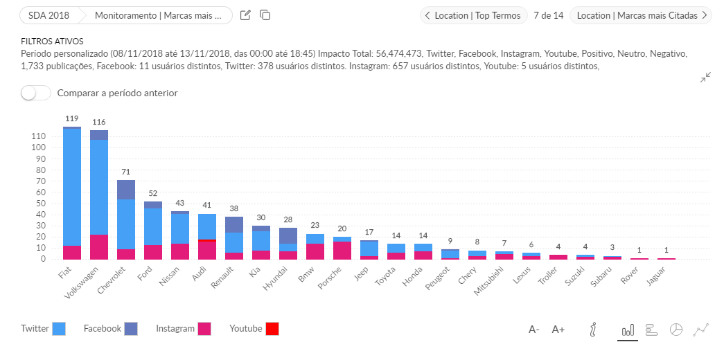 Com base nos principais termos das publicações, criamos também um relatório apenas com as marcas mais citadas nos posts de acordo com cada rede social. Fiat e Volkswagen despontam frente às demais, seguidas por Chevrolet, Ford e Nissan.