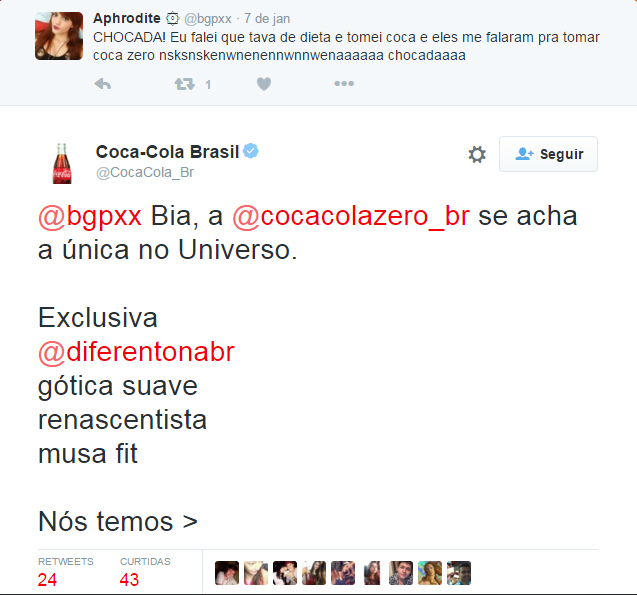 Nesse caso, a Coca-Cola aproveitou a oportunidade de interação com uma cliente em dieta e promoveu um dos produtos de seu catálogo, a Coca-Cola Zero: