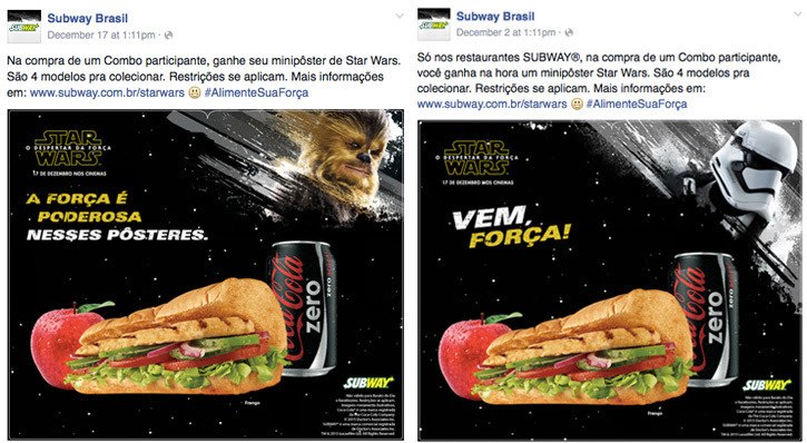 A rede de fast-food Subway focou em grupos específicos de clientes através de suas promoções. A marca usou a associação com o filme para impulsionar os Kid’s Pak – refeições para crianças, incluindo uma ofertas exclusivas do Episódio VII em cada Kid’s Pak.