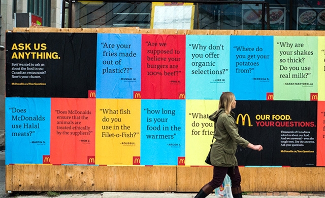 O McDonald’s Canadá decidiu enfrentar os mitos e desconfianças do público, convidando-os para o backstage de todo o processo de produção dos seus alimentos. Assim nasceu, em 2012, a plataforma “Our Food. Your Questions”, onde a marca responde às questões sobre os produtos alimentícios que vende: