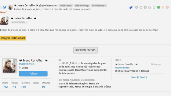 No Buzzmonitor, criamos um conceito simples mas poderoso para ajudar as empresas a conversar melhor com seus clientes. No Twitter, o Deep Profile permite à marca retirar um resumo diretamente da time-line da pessoa que fez a reclamação, como a bio, localização, marcas que refere e outros tweets.