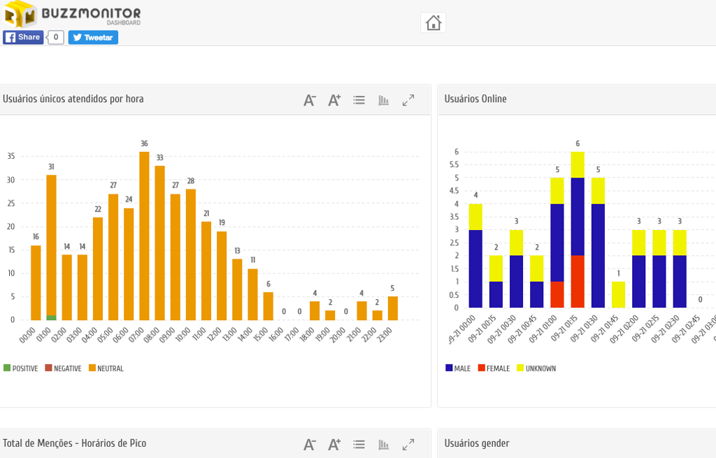 Através do Buzzmonitor conseguimos avaliar métricas como: os horários mais movimentados, os pedidos de intervenção humana, usuários atendidos por hora, os comandos mais e menos clicados, entre outras.