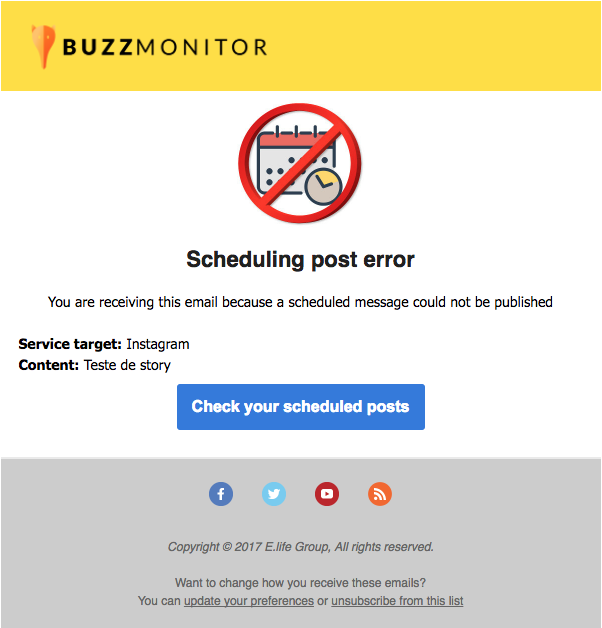 Nenhuma postagem deixará de ser feita a partir de agora! Caso um post agendado não seja realizado na data e horário previstos, automaticamente um e-mail será enviado para o administrador da conta alertando a falha. Assim postagens importantes não ficarão para trás e o analista poderá corrigir o erro com mais facilidade.
