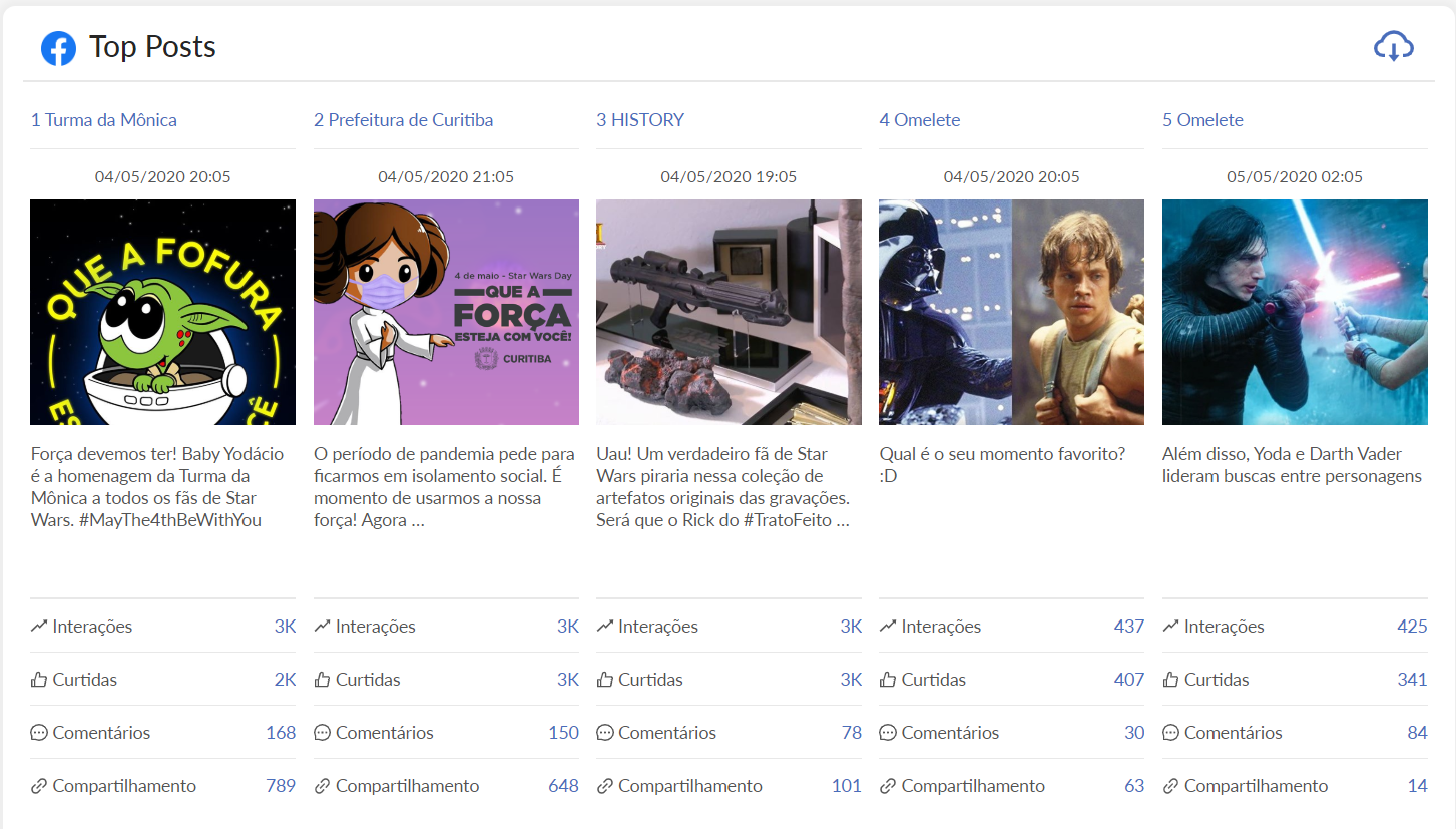 Os outros dois posts que aparecem no nosso top 3 tiveram também o mesmo número de interações que o primeiro. Mas o diferencial foi o número de compartilhamentos e comentários destas publicações. Com 648 compartilhamentos, o post da Prefeitura de Curitiba, incentivando o isolamento na pandemia, contempla a segunda posição. Na terceira temos a chamada do canal History com 648 compartilhamentos.