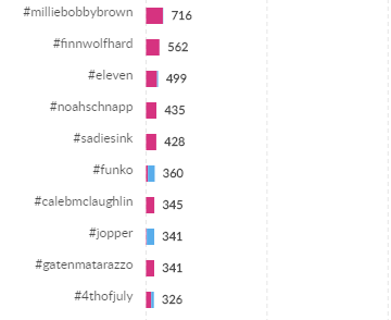 As hashtags mais usadas, além de #Strangerthings, fizeram referência aos atores da série. Dentre eles, Millie Bobby Brown e Finn Howard se destacaram, o casal adolescente de protagonistas de Stranger Things. Enquanto #StrangerThings totalizou 66% das hashtags, as que mencionam os atores tiveram em torno de 1% cada uma. A rede social mais usada para essas menções foi o Instagram, além de uma pequena parcela do Twitter.