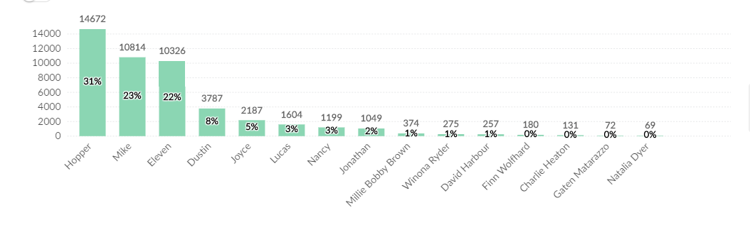 O curioso é que, no decorrer da semana, alguns personagens passaram a se destacar. Dustin, por exemplo, ultrapassou Mike e Eleven e acabou sendo um dos persongens mais mecionados na semana da estreia, com 117.885 menções. Ficou atrás apenas de Hopper, mencionado quase 154.000 vezes.