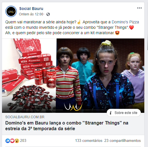 Os posts que geraram mais engajamento foram do veículo SocialBauru, que divulgou um combo especial da pizza Domino’s, e do HuffPost Brasil, que fez um artigo sobre a época em que a série se passa.