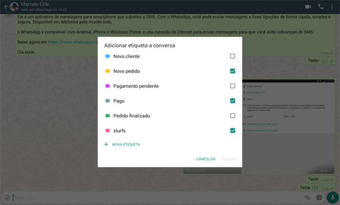 Basta selecionar a conversa e escolher a opção Adicionar etiqueta à conversa. Você escolherá em quais opções aquele cliente se encaixa melhor e também criar novas etiquetas nessa área. Importante! É possível filtrar posteriormente clientes de acordo com suas categorias. Por exemplo: se você deseja entrar em contato apenas com clientes que estão com pagamento pendente, basta filtrar por essa etiqueta.