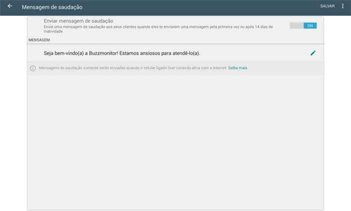 • Mensagem de Saudação: também pode ser ativada ou não, o texto pode ser configurado de acordo com sua necessidade, e sempre será enviada quando um cliente te enviar uma mensagem pela primeira vez ou após 14 dias de inatividade. Importante para gerenciar a expectativa de quem acabou de entrar em contato com sua empresa.