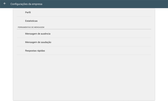 Nesta parte você pode configurar seu perfil, visualizar as estatísticas das suas conversas e definir suas mensagens de Ausência, Saudação e Respostas Rápidas.
