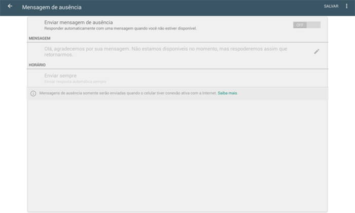 • Mensagem de Ausência: para quando seu responsável de atendimento não estiver ativo. É possível deixá-la ativa ou não, configurar o texto que será enviado e quais os horários em que essa mensagem será disparada.