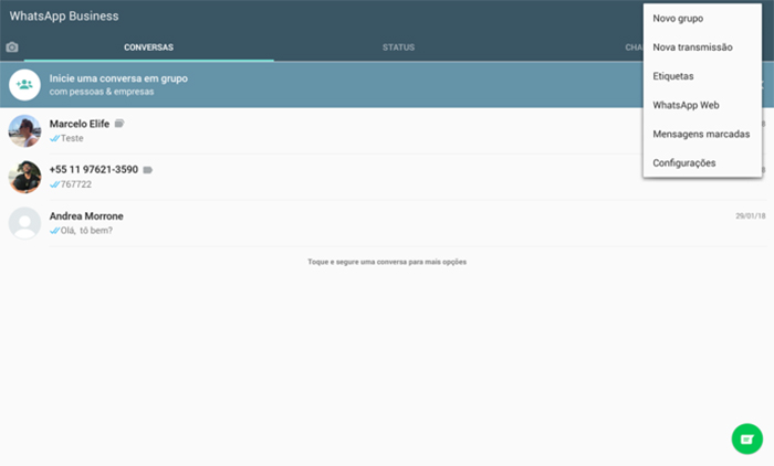 Clicando no canto superior direito é possível visualizar opções básicas, como Novo Grupo e Nova Transmissão, também disponíveis no WhatsApp original, e novas opções, como Etiquetas. Falaremos sobre isso mais adiante.