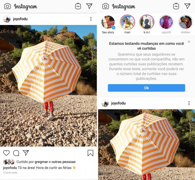 O Instagram vai iniciar no Brasil no dia 17 de julho um teste que oculta a visualização de curtidas em postagens. Essa nova aparência do feed da rede social foi testada no Canadá e gerou resultados positivos, segundo comunicado oficial do Instagram : “Estamos muito animados com os resultados iniciais, mas ainda é preciso estudar mais sobre como isso afeta a experiência do consumidor”.