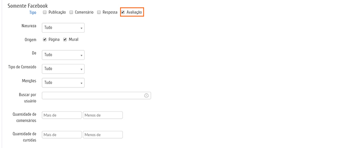 Crie um novo relatório. Em Filtros, deixe ativo apenas o serviço Facebook, selecione o período e em Somente Facebook deixe selecionado apenas Avaliação em Tipo.