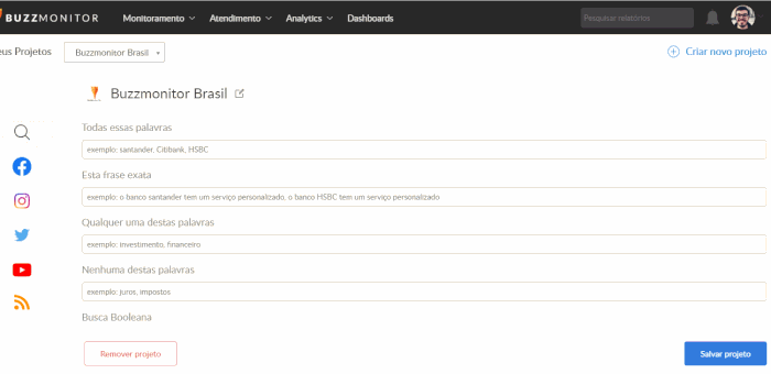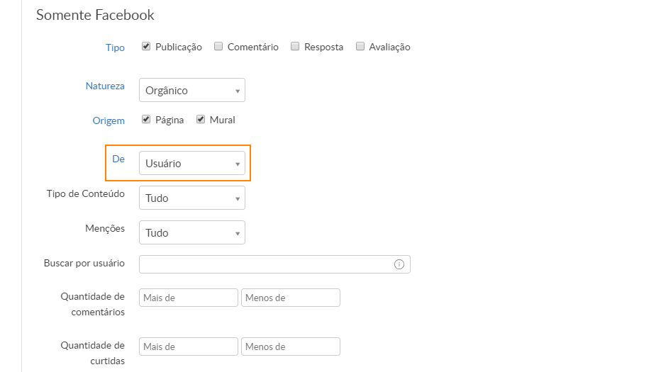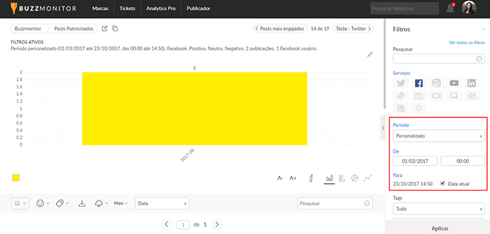 Como o perfil de sua marca já estará sincronizado ao Buzzmonitor, clique em Criar novo relatório, na aba Filtros deixe ativado apenas o serviço Facebook e selecione o período que deseja monitorar. Então, role a página até Somente Facebook e filtre os posts apenas de Usuários.Quando um usuário menciona a marca em uma publicação, isso entra como post no Buzzmonitor.