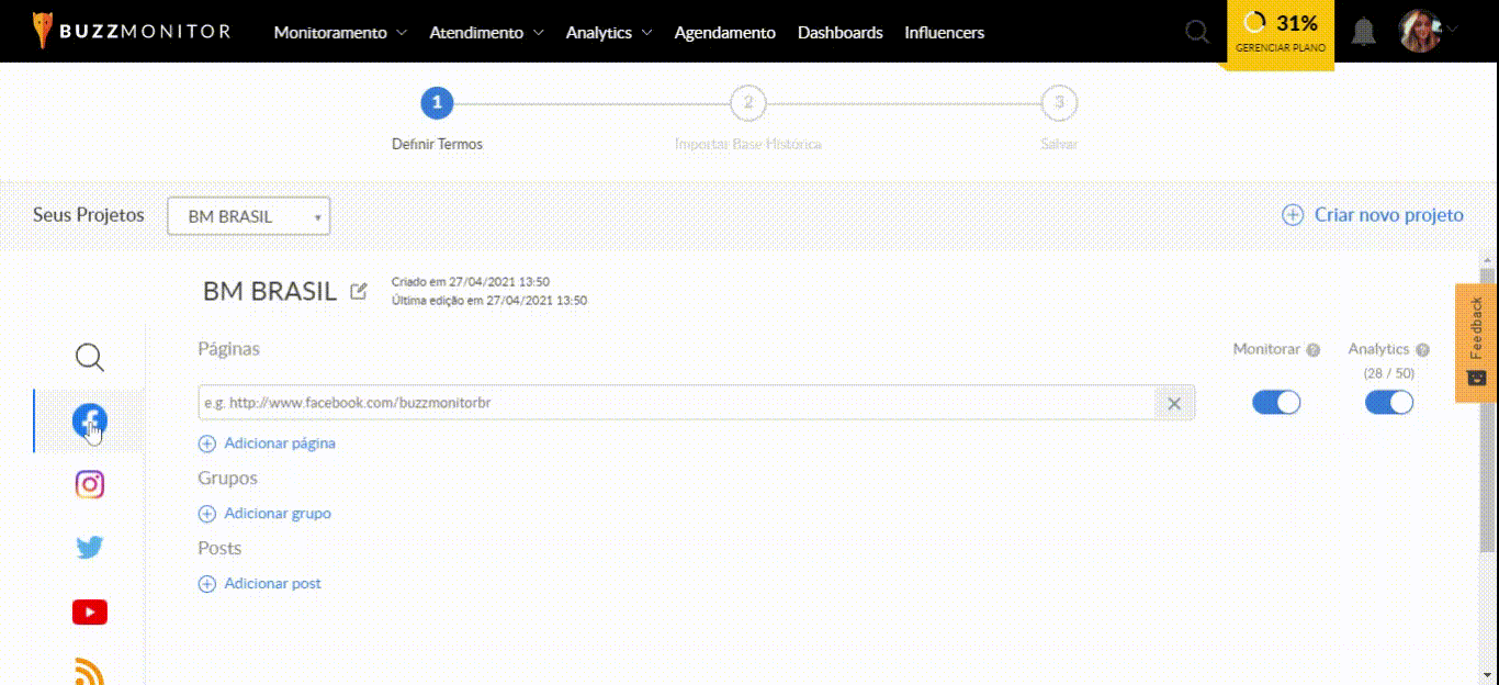 Atualmente é possível coletarmos somente informações públicas de páginas e o cadastro é feito através da URL da página desejada como mostrado na imagem abaixo.