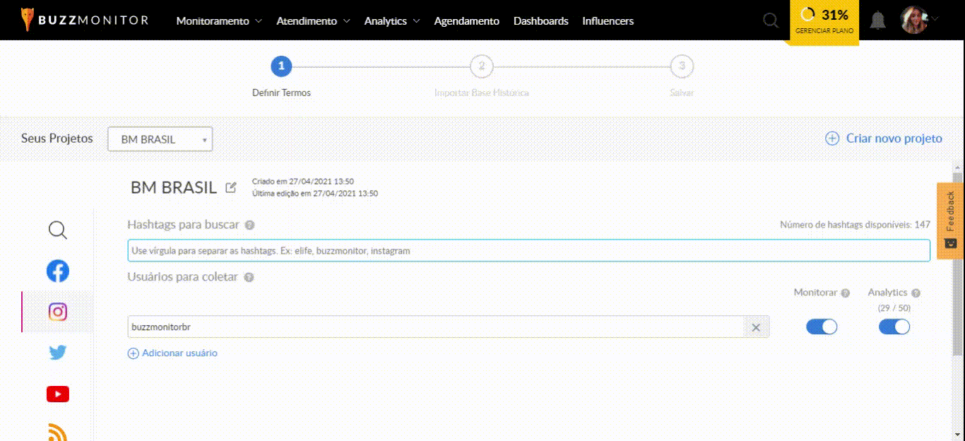 • Existe um limite para coleta de hashtags. Para cada conta de Instagram autenticada na conta do Buzzmonitor é possível monitorar 30 hashtags. Esse limite será exibido no cadastro de brands conforme o número de contas de Instagram autenticadas. Há alguns detalhes sobre esse limite: