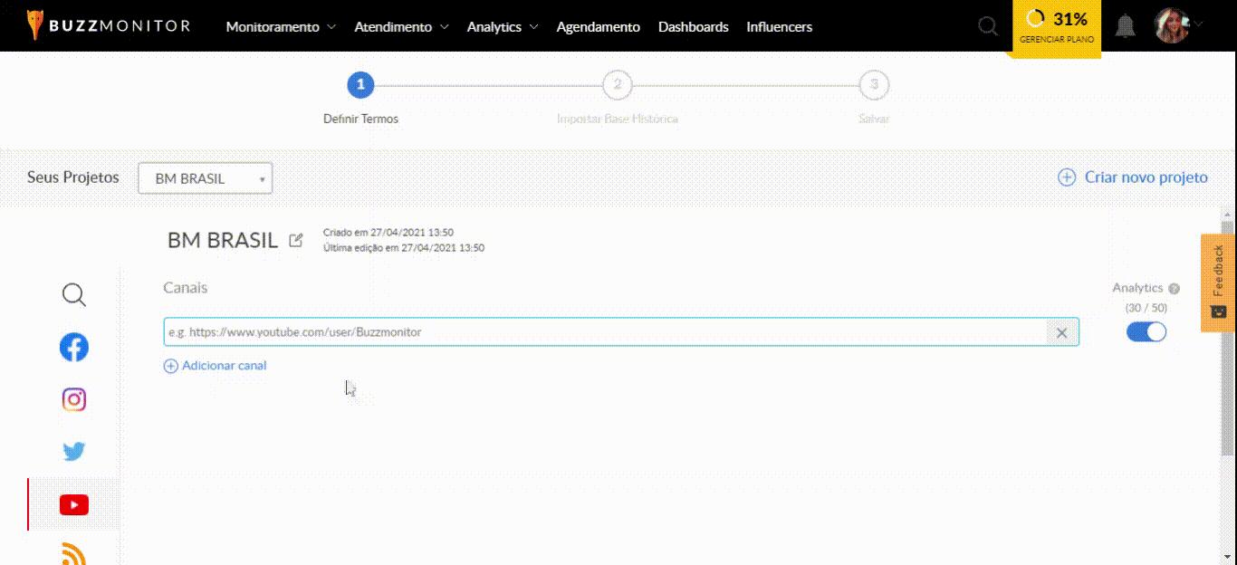 Para os canais que não administramos é preciso colocar o link do canal no Buzzmonitor como na imagem abaixo. Importante que seja o link que contenha a palavra channel, feito isso será possível ter dados de performance deste canal.