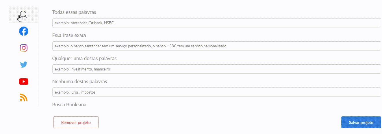 Em termos de busca você deve preencher as palavras-chave através de termos booleanos no início do cadastro do seu projeto e os operadores devem sempre estar em caixa alta.