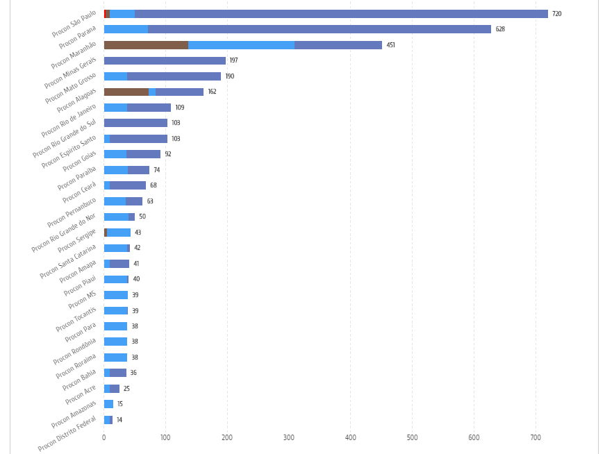 O PROCON São Paulo dispara frente aos demais, com 720 publicações feitas durante os últimos 60 dias nas quatro redes sociais (670 no Facebook, 40 no Twitter, 7 no Instagram e 3 no YouTube). Em segundo lugar aparece o PROCON Paraná com 628 publicações (556 no Facebook e 72 no Twitter), seguido pelo PROCON Maranhão com 451 publicações (172 no Twitter, 142 no Facebook e 137 no Instagram). Esses números levam em consideração apenas as publicações dos PROCONs e não contabilizam comentários e postagens de usuários.