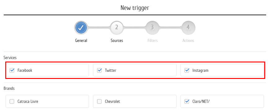 • Em Sources, selecione as páginas onde os alertas serão aplicados e em quais redes (Facebook, Twitter e Instagram).