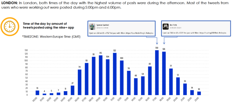 Comparamos o horário de postagem dos usuários do aplicativo Nike+, nas cidades de Nova Iorque e Londres, para saber qual horário do dia estas pessoas preferem se exercitar.