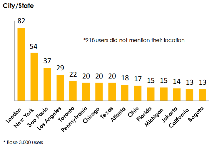 Estados Unidos foi o país que apresentou a maior quantidade de usuários de aplicativos fitness, cuja maioria (54 usuários) encontra-se na cidade de Nova Iorque. Já a cidade com o maior número de usuários é Londres (82 usuários). No Brasil, São Paulo é a cidade com maior número de usuários de aplicativos fitness (37 usuários).