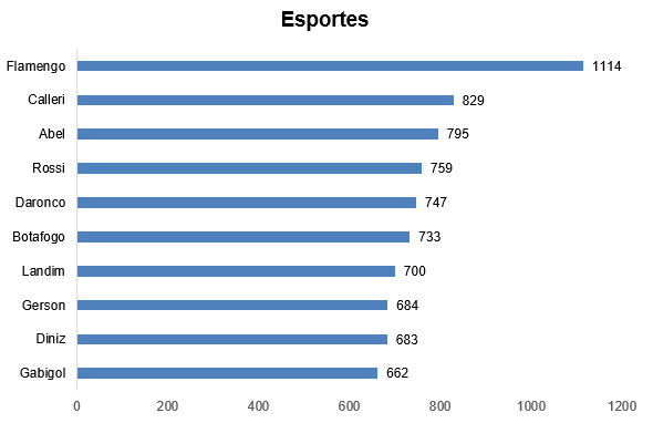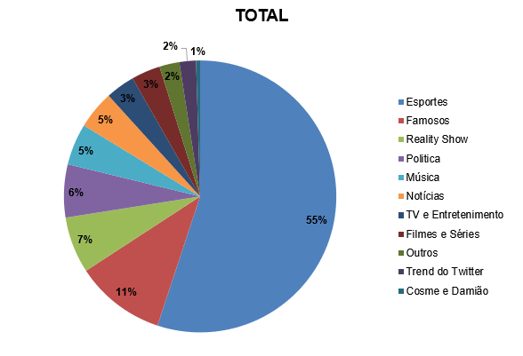 A categoria mais comentada foi Esportes, com 55% do total das conversas. Em seguida, as categorias de Famosos (10,7%), Realitys Shows (6,7%), Política (6,3%) e Música (4,9%).