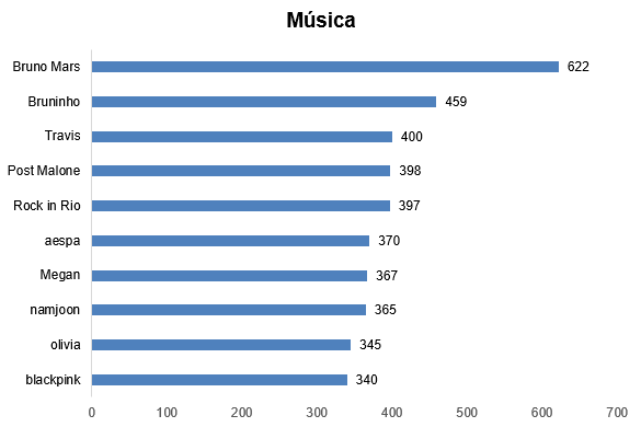 A categoria Música foi responsável por 5% do buzz do período. E o grande destaque foi a apresentação do cantor Bruno Mars no The Town. Durante o show, o cantor adotou o apelido carinhoso de “Bruninho”, prontamente aderido pelos fãs nas redes sociais.