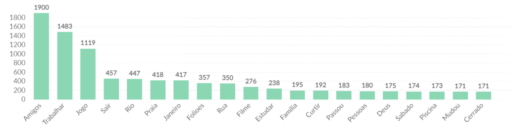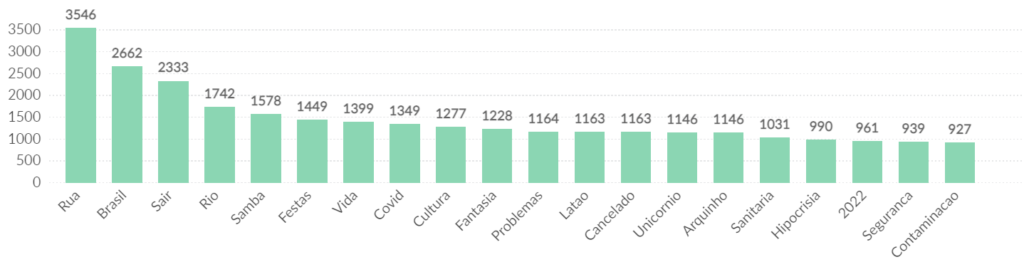 Com a proibição das festas oficiais, mas ocorrência das festas privadas, o movimento nas redes sociais em relação ao Carnaval 2021 aponta ser outro. No top 20 dos termos mais mencionados do estudo, estão “festa”, “rua”, “sair”, “samba” e “cultura”. Na lista também podemos observar as preferências dos internautas (“unicórnio” e “tiara”) sobre as vestimentas preferidas para as festas. Há ainda os que discutam sobre a polêmica que envolve a proibição das festas de rua, através do termo “hipocrisia”.