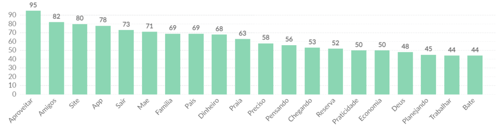 Ao isolar os posts de Carnaval apenas em relação aos que citam “viagem” ou “viajar”, percebemos quem irá acompanhar os usuários nessas viagens: “amigos”, “mãe”, “família”, e “pais”. O destino mais citado é a “praia” e os internautas demonstram interesse em efetuar a compra online, pela presença dos termos “site”, “app”, “reserva” e “economia”.