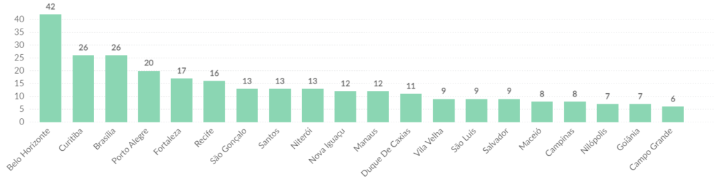 De onde vem o maior buzz sobre viagens e Carnaval? Em primeiro lugar, está a cidade de Belo Horizonte, Curitiba e Brasília. O Sudeste, aliás, é a região com a maior proporção de menções Carnaval + viagem. No agrupamento das 20 top cidades que mais falaram sobre o Carnaval temos: