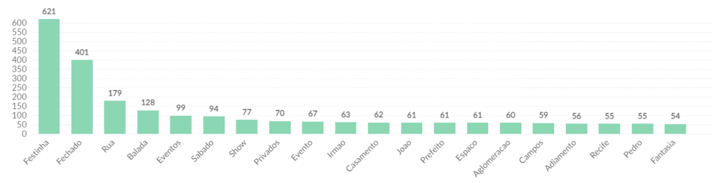 Com o cancelamento dos carnavais de rua, estão ganhando destaque os eventos “fechado” e “privados”. Na temática da festa, também vieram à tona polêmicas sobre o decreto das cidades, relacionado ao Prefeito de Recife: João Campos (“joão”, “prefeito” e “campos”). Logo após a suspensão do Carnaval e férias coletivas dos servidores de saúde, ele foi muito criticado por estar presente na festa de casamento do irmão, João Campos, que teve 300 convidados (citada através dos termos “casamento”, “pedro” e “aglomeração”).