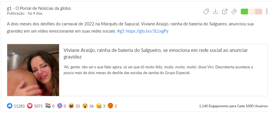 No período de 22/01 a 22/02, o post com mais reações amei no Facebook citaram a gravidez de Viviane Araújo, que estará presente nos desfiles da Sapucaí (representando a Salgueiro) que foram adiados para Abril. No total foram 5071 corações.