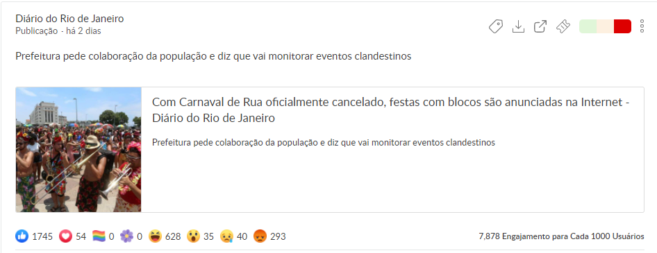 Já a publicação mais odiada (com reação grr), abordou a fiscalização da Prefeitura do Rio de Janeiro em relação às festas clandestinas. No total, foram 293 reações do emoji angry.