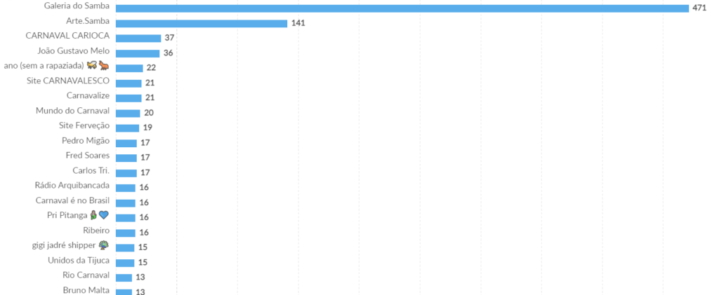O monitoramento do Buzzmonitor permite identificar usuários do Twitter que citam palavras específicas na bio e o volume de seus posts com o termo. Ao analisarmos a palavra Carnaval, se destacaram os perfis que falam de escolas de samba: Galeria do Samba (417 postagens), Arte Samba (141 postagens) e CARNAVAL CARIOCA (37 postagens).