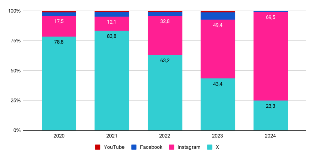 No X, o texto perdeu espaço. Embora ainda seja o formato prevalente, com 76,9% das publicações. O texto deu lugar a publicações em vídeo (9,6%) e, principalmente, a imagens (13,5%). O Facebook manteve os quadros de 2023: A rede é espaço para compartilhamento de imagens (57,1%), links (31,1%) e vídeos (11,8%). No YouTube, outro formato chamou atenção. Publicações em texto aumentaram a sua participação com relação aos vídeos na rede, passando de 23,8% para 39%.