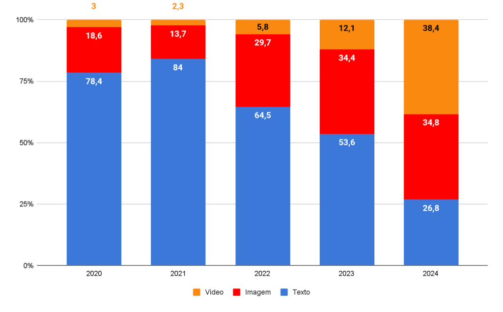 Vídeos se tornam o principal formato das publicações e, este ano, têm participação 3 vezes maior do que no ano passado. Imagens se mantêm estáveis e o texto perde espaço.